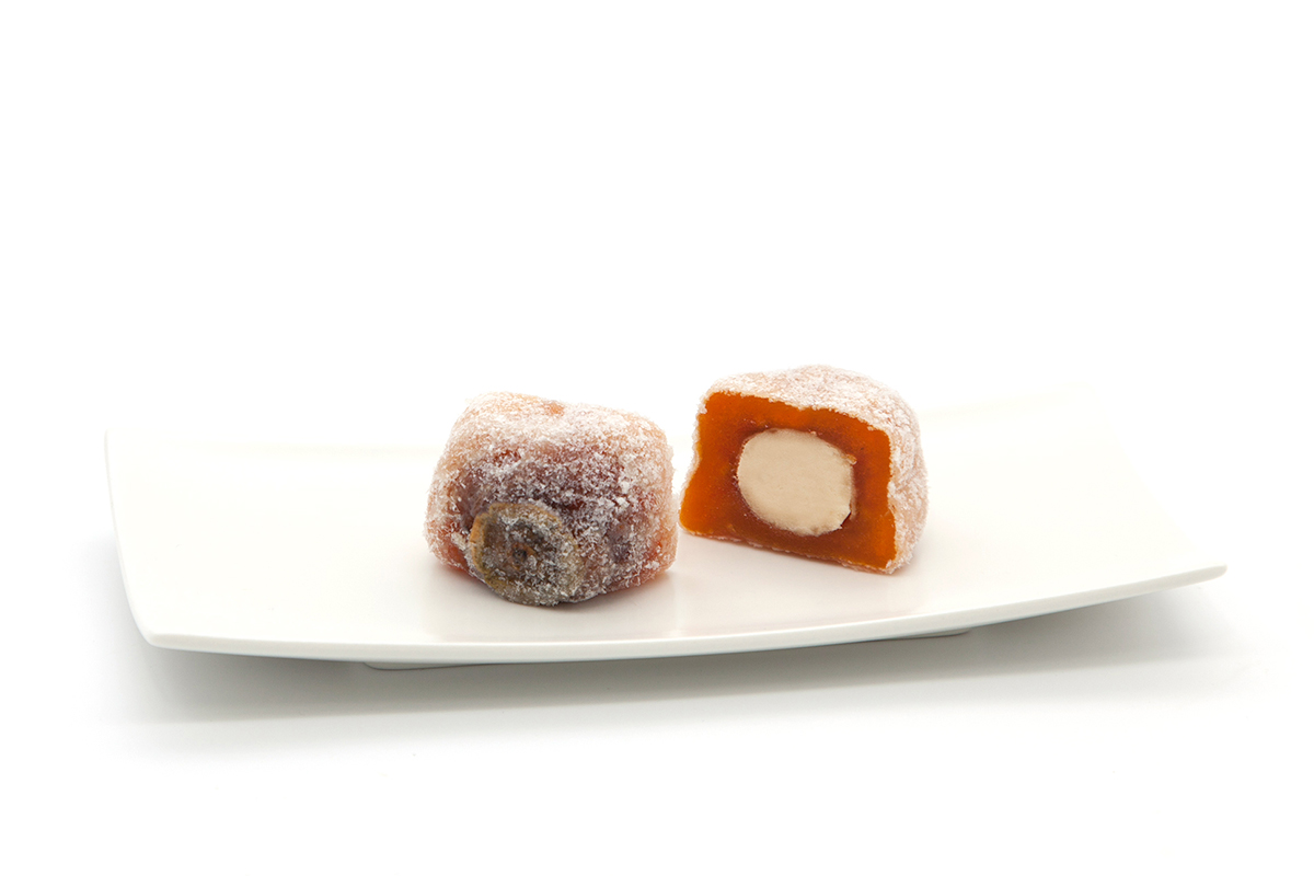 干し柿には、吉野本葛の衣をまとわせ、さらにもち米のパウダーを一つひとつ丁寧にまぶしています。